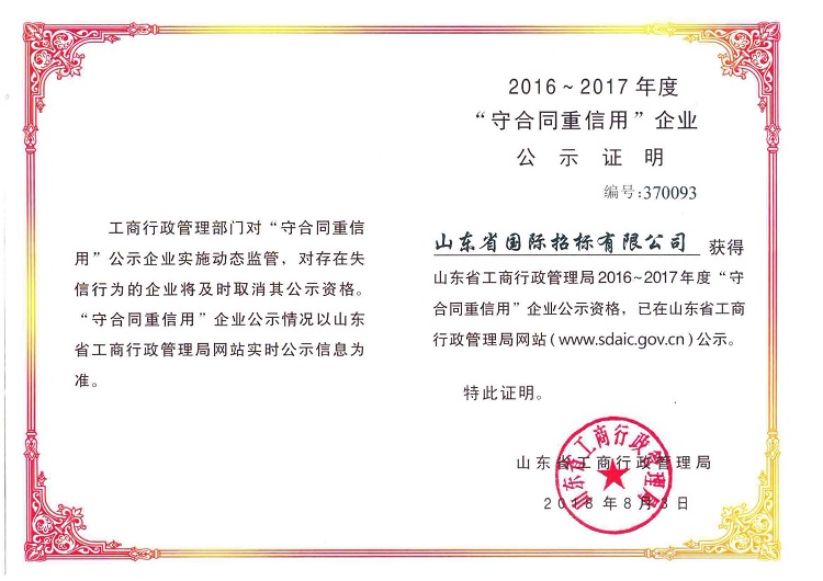 山東省國際招標有限公司被認定為2016~2017年度山東省“守合同重信用”企業(yè)。